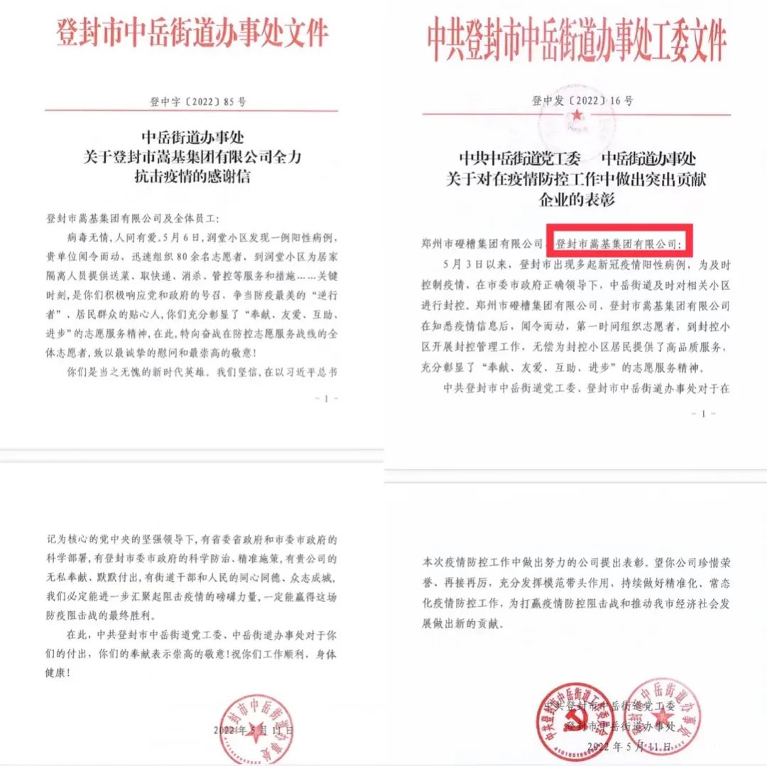 5月11日,中共登封市中岳街道辦事處下發(fā)《關(guān)于對(duì)在疫情防控工作中做出突出貢獻(xiàn)企業(yè)的表彰》,對(duì)嵩基集團(tuán)第一時(shí)間組織志愿者到封控小區(qū)開展封控管理工作表示衷心的感謝。