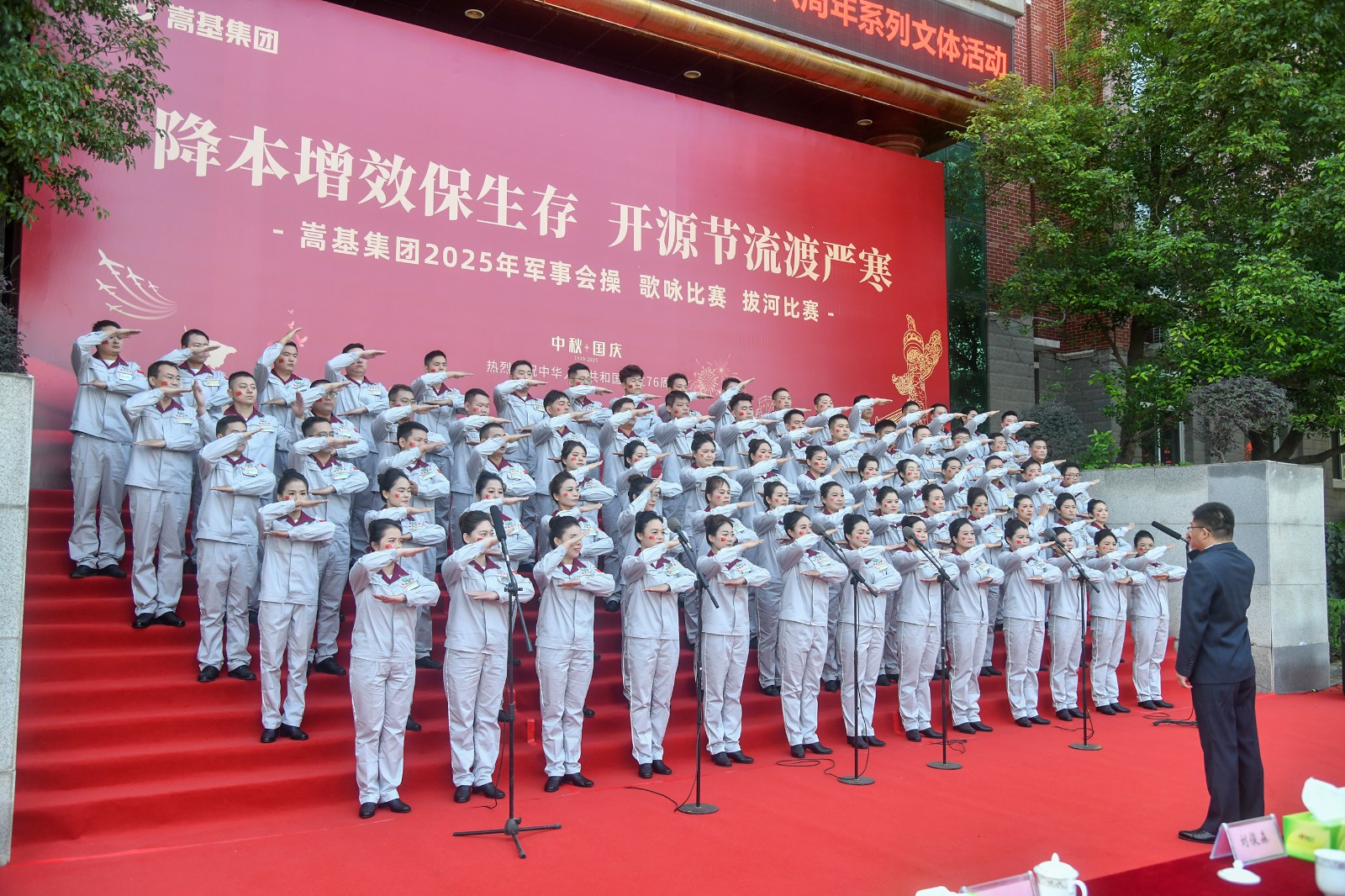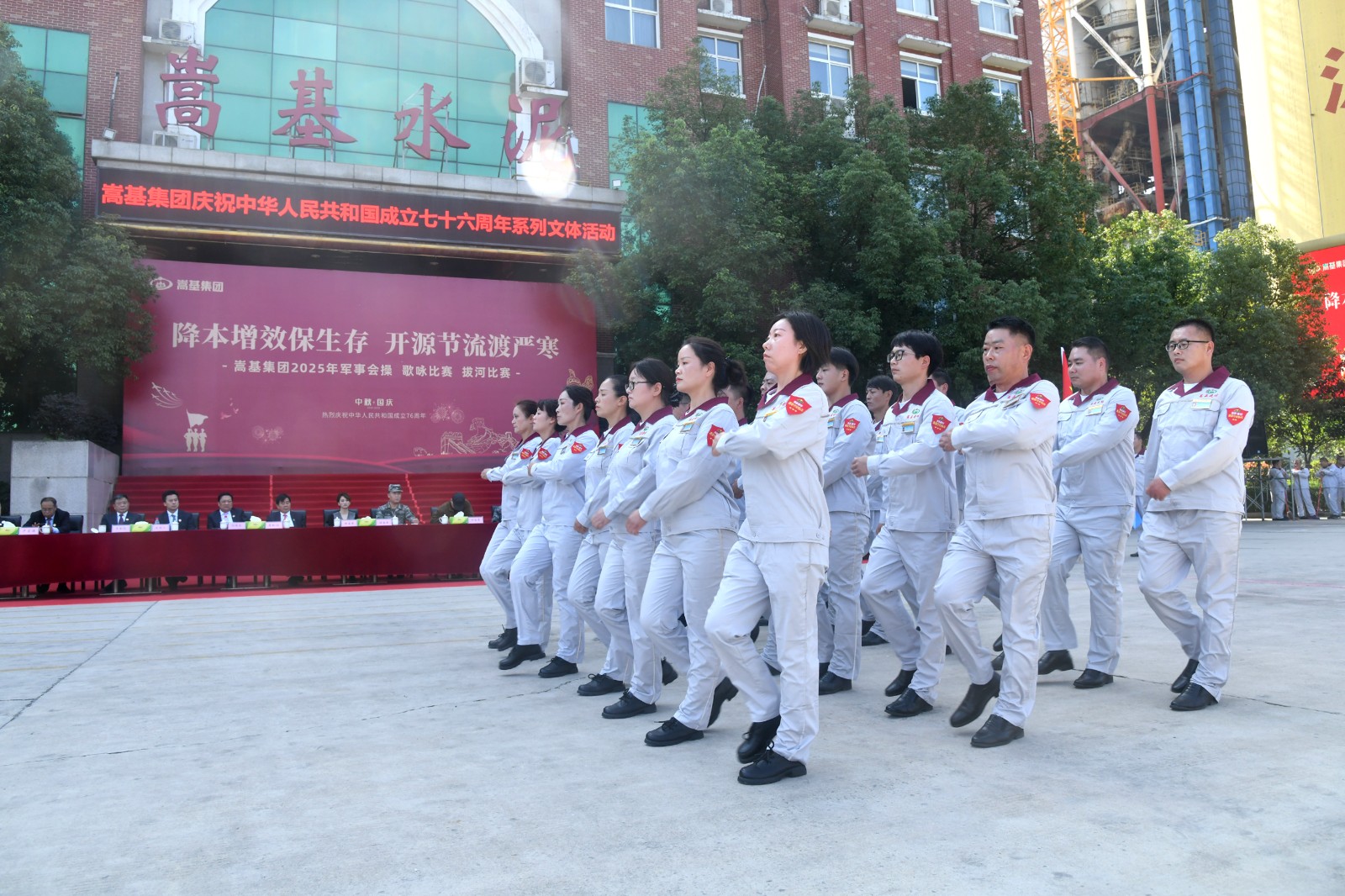 9月30日上午,嵩基集團在嵩基水泥迎賓廣場隆重舉辦以“降本增效保生存 開源節(jié)流渡嚴寒” 為主題的慶祝中華人民共和國成立76周年軍事會操、歌詠比賽及拔河比賽系列文體活動。此次活動旨在喜迎新中國76周年華誕,凝聚奮進力量,展現(xiàn)企業(yè)風(fēng)貌。集團公司董事長屈松記、總經(jīng)理李天義等領(lǐng)導(dǎo)出席活動,各單位代表隊及觀摩人員510余人參加。